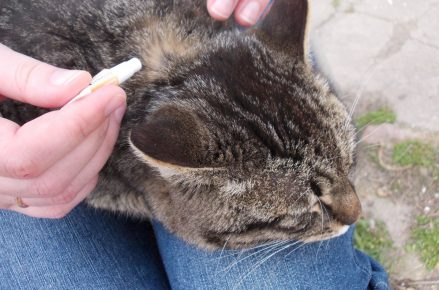 Перед началом обработки животного необходимо удалить с тюбик-пипетки колпачок. Надев его обратной стороной, резким поворотом нужно проколоть защищающую мембрану, которая расположена на носике тюбика. Возьмите на колени кота, погладьте и аккуратно, чтоб он не испугался, одной рукой раздвиньте его шерсть на холке — это область между лопатками, у основания черепа. Другой рукой надо нажать на тюбик-пипетку и нанести капли на оголённый кожный покров