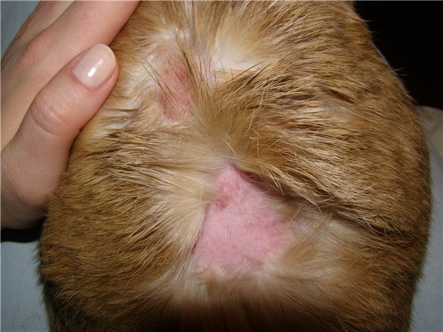 Данный недуг вызывает грибок. Он внедряется в кожу и там размножается. В результате на шкурке животного образуются округлые пятна розового цвета с затемнённым ободком. Шерсть в этих местах отпадает, она выглядит так, словно её коротко подстригли. Очаги поражения сильно зудят, шелушатся, на них образуются корочки.