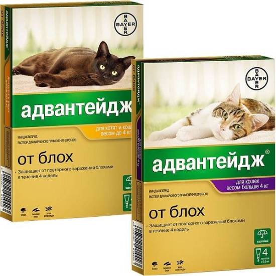 - Advantage. Рассматривая лучшие капли, ориентированные на уничтожение блох у котов, необходимо отметить немецкий препарат Адвантейдж, базовым веществом которого является имидаклоприд. Реализуется в тюбиках, содержимое которых выдавливается на холку раз в месяц. Котятам препарат разрешен с двух месяцев. После обработки необходимо проконтролировать, чтобы в течение трех часов маленькие питомцы не слизнули инсектицид.
