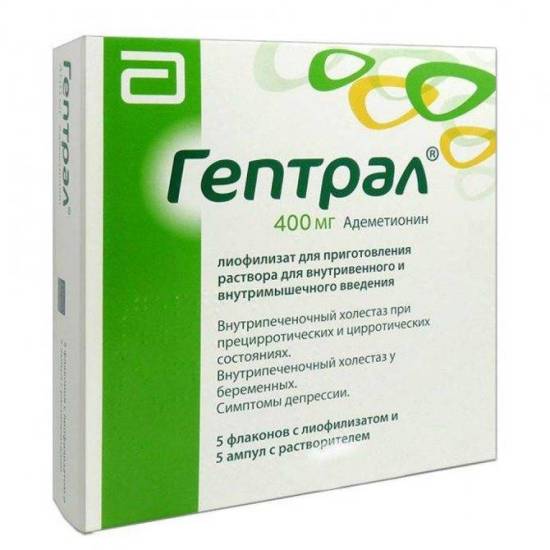 | Гептрал | Адеметионина 1,4-бутандисульфонат, кремния диоксид коллоидный, целлюлоза микрокристаллическая, карбоксиметилкрахмал натрия, добавка Е572. | Таблетки | Повышенная чувствительность к ингредиентам препарата, беременность, лактационный период, дефицит витамина В12. | Тошнота, рвота, боли в животе и суставах, понос, нарушение пищеварения, сухость во рту, метеоризм, печеночные колики, кровотечения в органах желудочно-кишечного тракта, судороги, онемение конечностей, нарушение сна, затрудненное мочеиспускание, высыпания на коже, зуд, гиподинамия, снижение аппетита, воспаление и некроз тканей в месте введения иглы. |