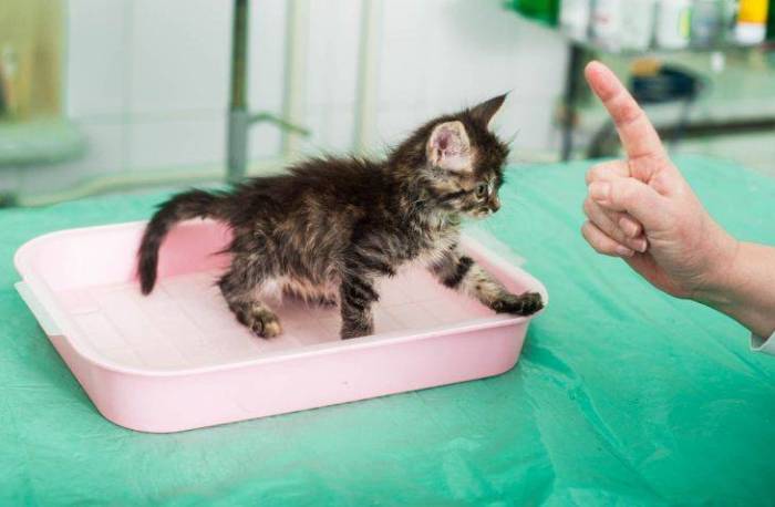 После нескольких оперативных вмешательств котенок начнет понимать, что от него хотят на уровне рефлекса.