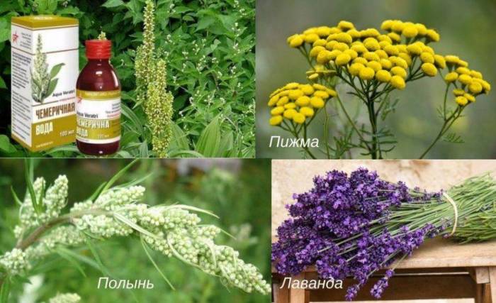 Фитосредства (пижма, полынь, эвкалипт и т.д.). Растения с резким запахом издавна применяются для отпугивания всевозможных вредителей, в том числе и эктопаразитов у питомцев. Чаще всего применяются отвары таких трав, как пижма, полынь, герань, лаванда для гигиенической обработки помещения, предметов ухода за животным. Отварами трав можно мыть полы для предупреждения развития в жилом доме яиц и личинок кошачьих блох.