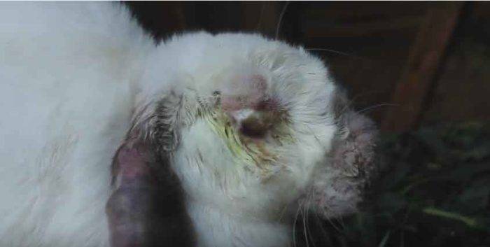 - Миксоматозу. Болезнь передается при контакте с насекомыми либо животными-носителями. Сопровождается вялостью, отсутствием аппетита, отечностью, скатыванием и выпадением меха в районе глаз. Также может быть синюшность слизистой, опускание ушей, слепота и снижение веса животного, а также повышение температуры. Заболевание не поддается лечению. Если заразилась одна особь, подлежит истреблению всё стадо.