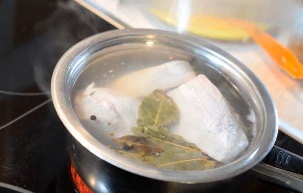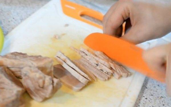 Кусочек свинины сварить до мягкости в подсоленной воде со специями и приправами. Остудить и нарезать небольшими кубиками.