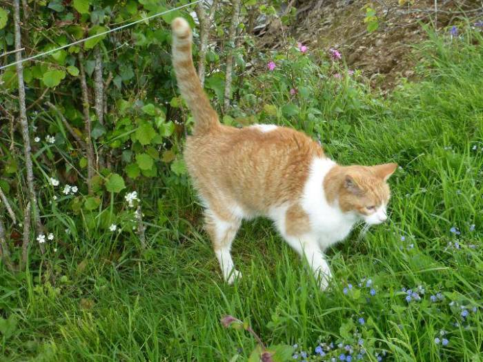Пачканье мебели, занавесок, одежды, хозяйских тапок и прочих предметов домашнего быта свидетельствует о том, что началась половая охота. Посредством выделяемых ферромонов самки оповещают самцов о своей готовности к размножению, а самцы отпугивают других котов, давая им понять — вход на чужую территорию воспрещен. Процесс мечения происходит так: животное подходит задом к вертикальной поверхности (стене, дверям, мебели), поднимает хвост и потрясывающими движениями оставляет на поверхности зловонные следы.