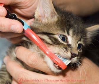 В принципе, различий как чистить зубы котенку или взрослой кошке нет, просто будьте аккуратней, т.к. котята более хрупкие. Держа их, постарайтесь не травмировать нежные десны.