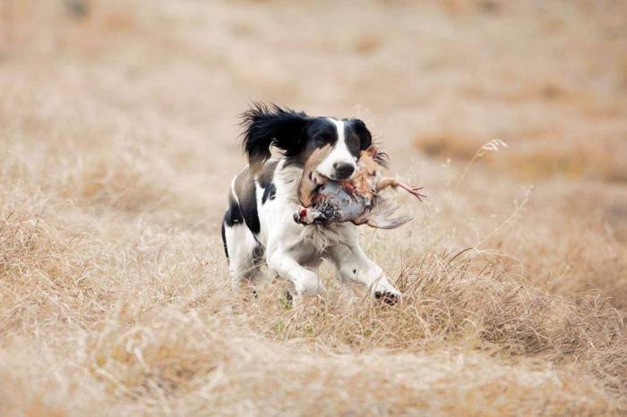 Необходимо обучать спаниеля охотничьим навыкам. Животное должно уметь выслеживать дичь, поднимать ее на крыло и приносить подстреленную добычу хозяину. Для таких тренировок используют заранее заготовленные крылья мелких и крупных птиц, засушенные вместе с перьями.