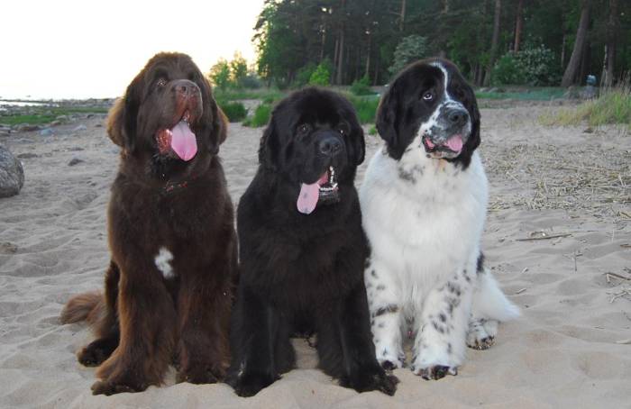 Каштановые ньюфаундленды могут иметь шерсть разных оттенков – от бурого до бронзового (см. фото). При черно-белом окрасе предпочтение отдается собакам, у которых морда и нижняя часть туловища имеют белый цвет, а остальные части тела – черный.