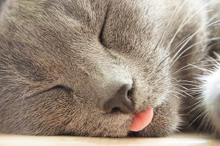 Когда кошка спит, мышцы языка расслаблены, и он естественным образом удлиняется. Поэтому у животного бывает полуоткрыт рот и из него высунут кончик этого мышечного органа.